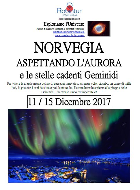 Norvegia 2017: Aurore e meteore Pubblicato da esploriamoluniverso in 5 agosto 2017 Pubblicato in: viaggi scientifici. Tag: aurore boreali, geminidi, norvegia, Stelle cadenti. meteore. Lascia un commento Per il programma completo clicca qui: ASTROTURISMO Malangen & Tromso DEC 2017 Condividi:CondivisioneTweet Fai clic qui per stampare (Si apre in una nuova finestra) Stampa Fai clic per inviare un link a un amico via e-mail (Si apre in una nuova finestra) E-mail Fai clic per condividere su WhatsApp (Si apre in una nuova finestra) WhatsApp Fai clic qui per condividere su Reddit (Si apre in una nuova finestra) Reddit Fai clic per condividere su Telegram (Si apre in una nuova finestra) Telegram Mi piace Caricamento...