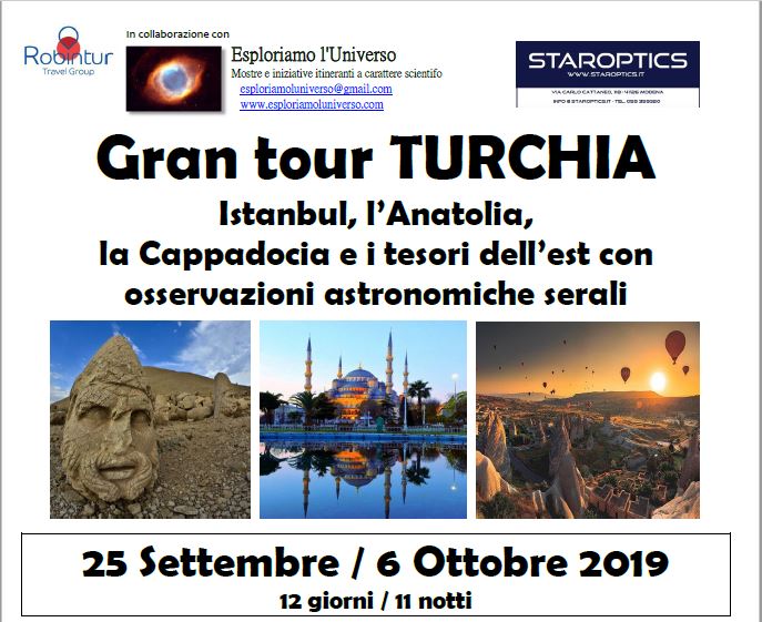 Viaggio in Turchia con osservazioni astronomiche dal 25 Settembre al 6 Ottobre 2019! Pubblicato da esploriamoluniverso in 24 Maggio 2019 Pubblicato in: viaggi scientifici. Lascia un commento Clicca qui per il programma completo: TURCHIA Gran Tour ASTROTURISMO – Settembre 2019 Condividi:CondivisioneTweet Fai clic qui per stampare (Si apre in una nuova finestra) Stampa Fai clic per inviare un link a un amico via e-mail (Si apre in una nuova finestra) E-mail Fai clic per condividere su WhatsApp (Si apre in una nuova finestra) WhatsApp Fai clic qui per condividere su Reddit (Si apre in una nuova finestra) Reddit Fai clic per condividere su Telegram (Si apre in una nuova finestra) Telegram Mi piace Caricamento...